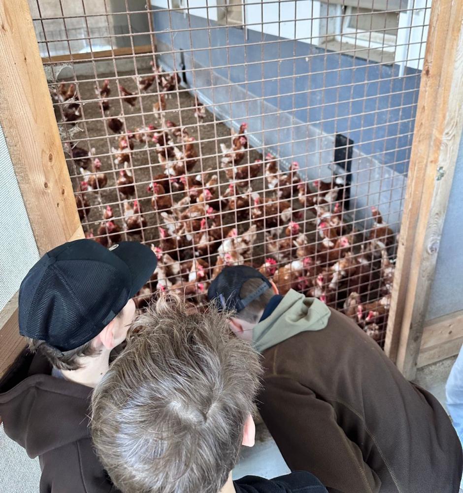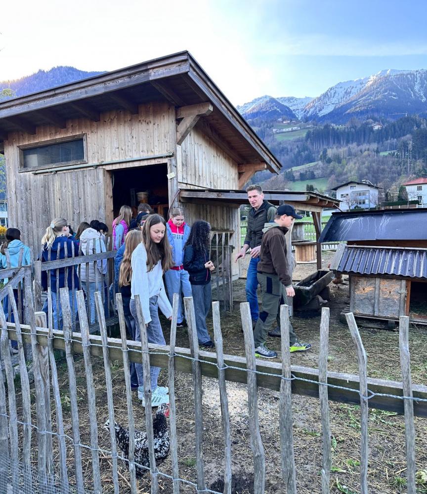 Nach den Osterferien startete die 1B mit einem Sonderprogramm in den ersten Schultag: gleich um acht Uhr machten wir uns auf den Weg zum Pirchnerhof. Das Thema Nutztiere stand auf dem Programm, und wir erfuhren von Bauer Walter Kreidl Interessantes zur Haltung von Rindern und lustige Geschichten über die Bewohnerinnen des Hühnerstalls. Die vorlauten Jungrinder ließen es sich auch nicht nehmen, den einen oder anderen aus unserer Gruppe einmal abzuschlecken (auch Frau Professor Steiner blieb da natürlich nicht verschont). Als Abschluss zeigte Lukas uns noch, wie man gekonnt ein Huhn fängt, bevor wir zur zweiten Stunde wieder zurück in die Schule marschierten.