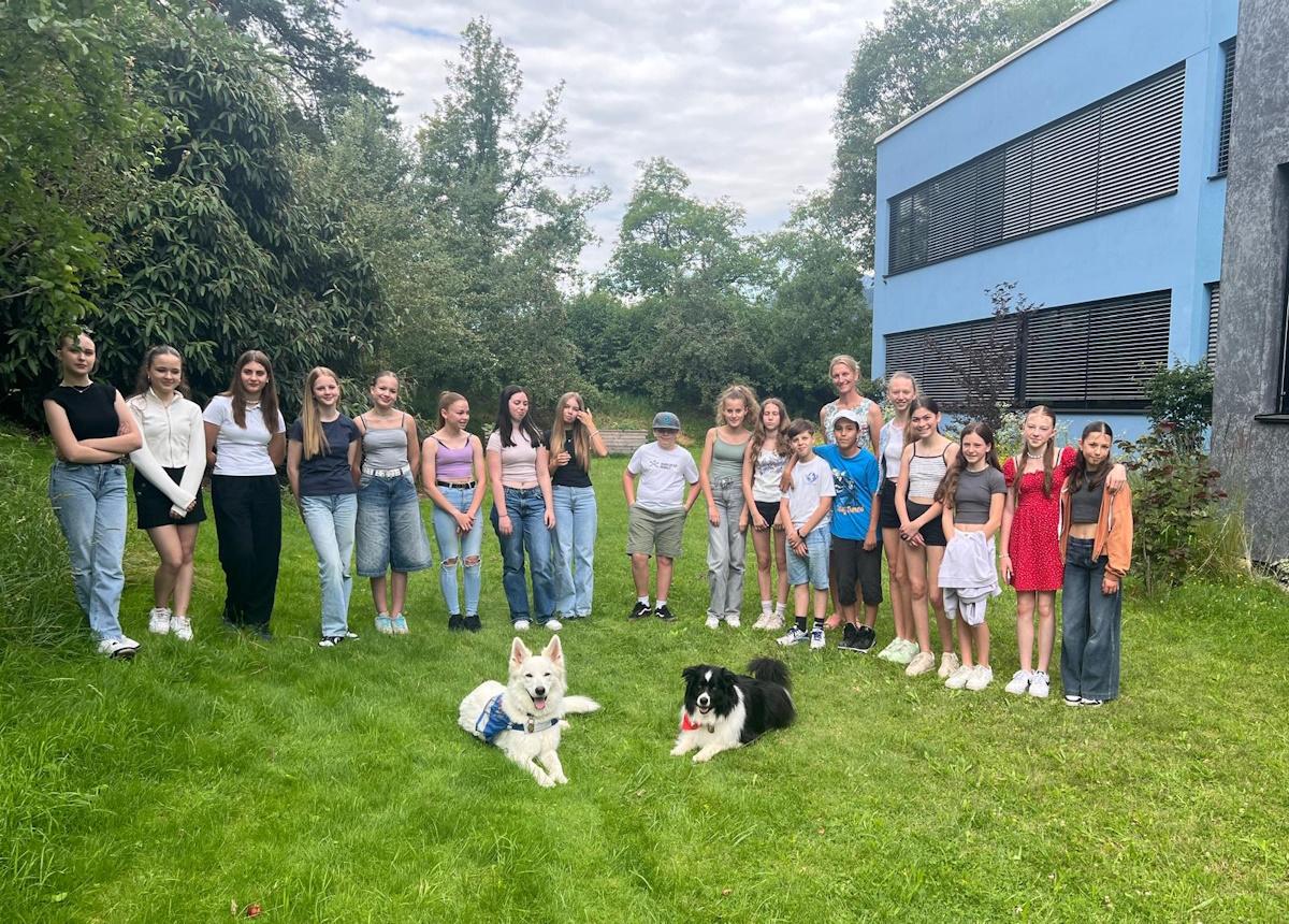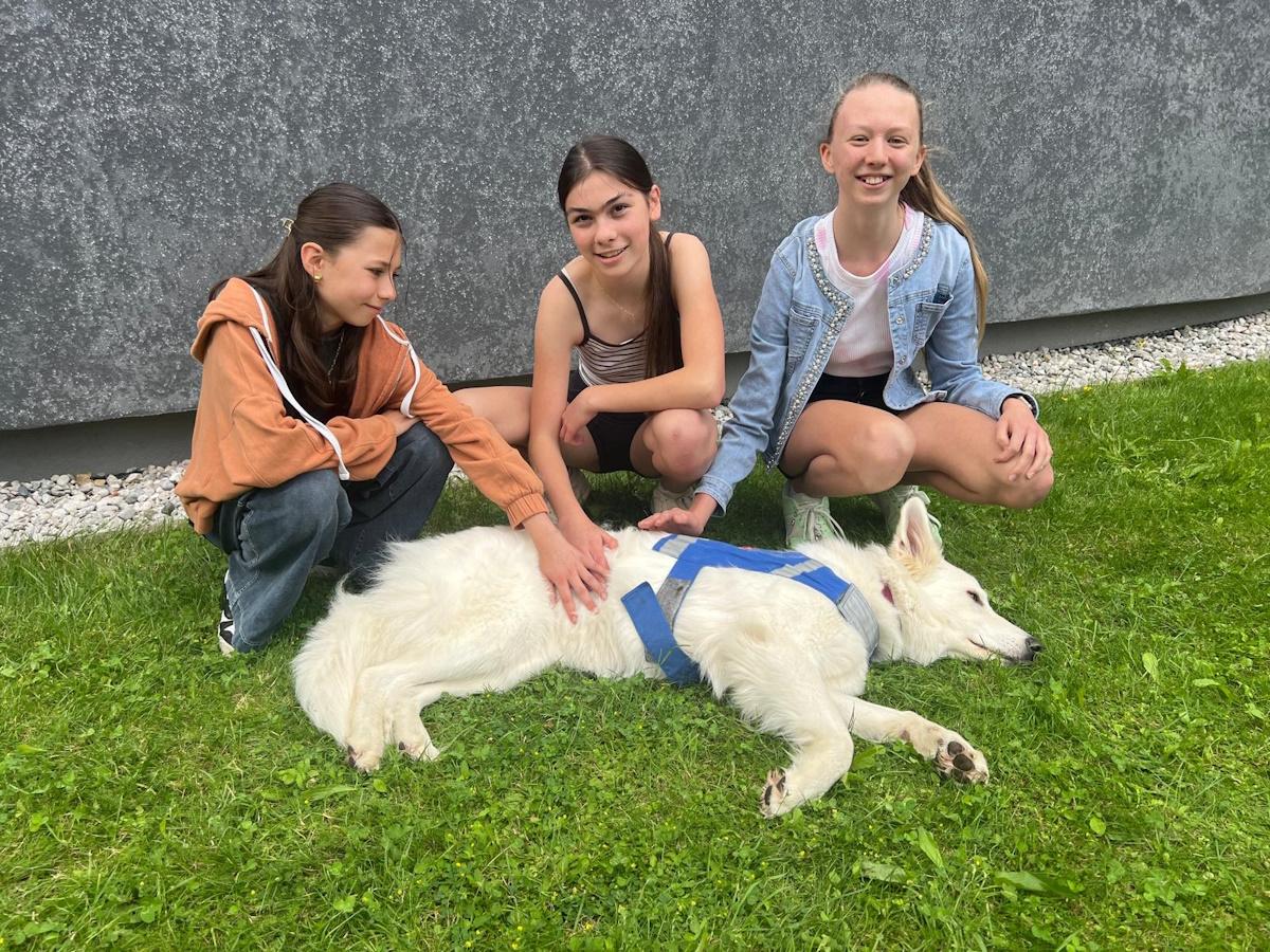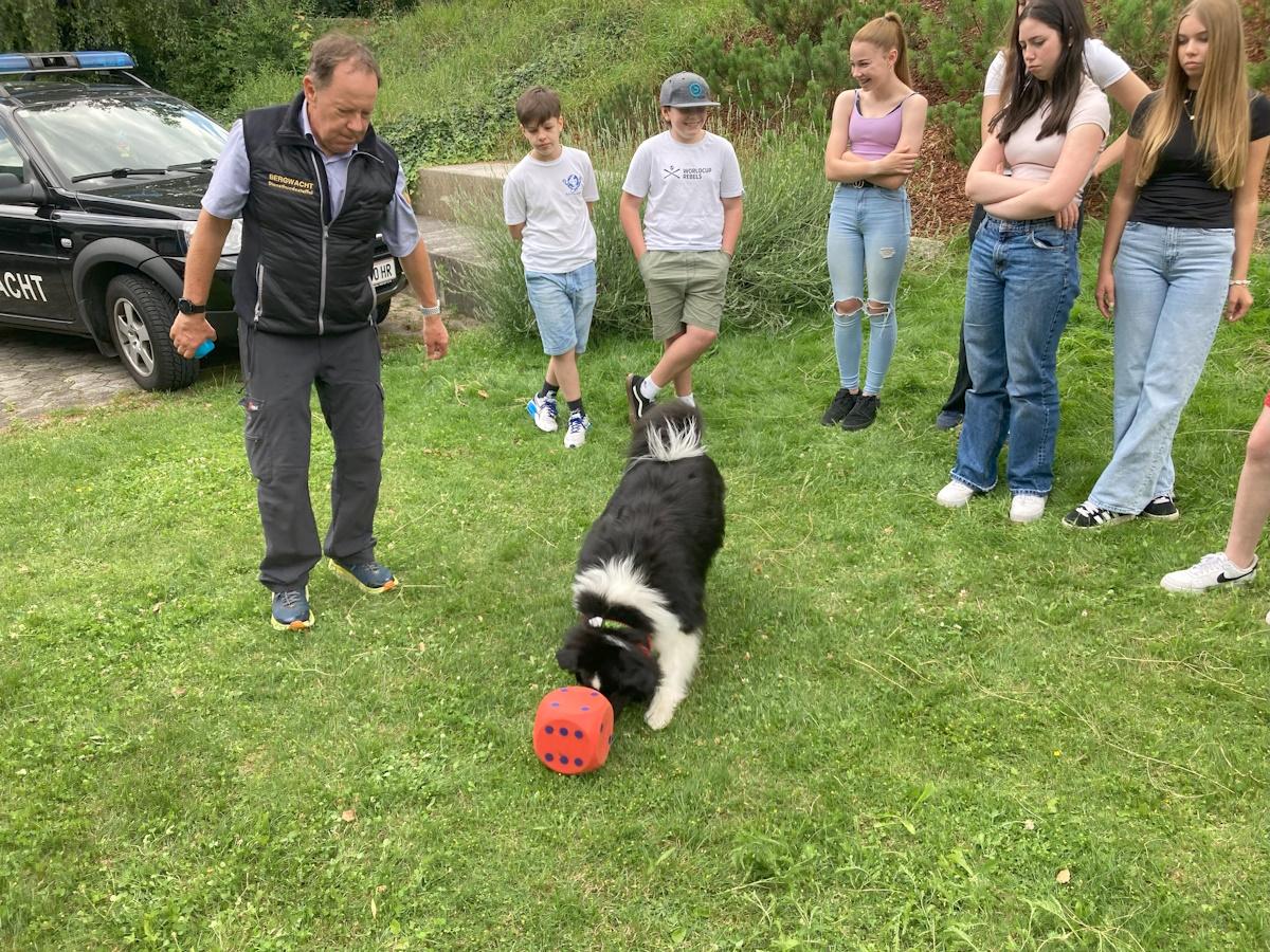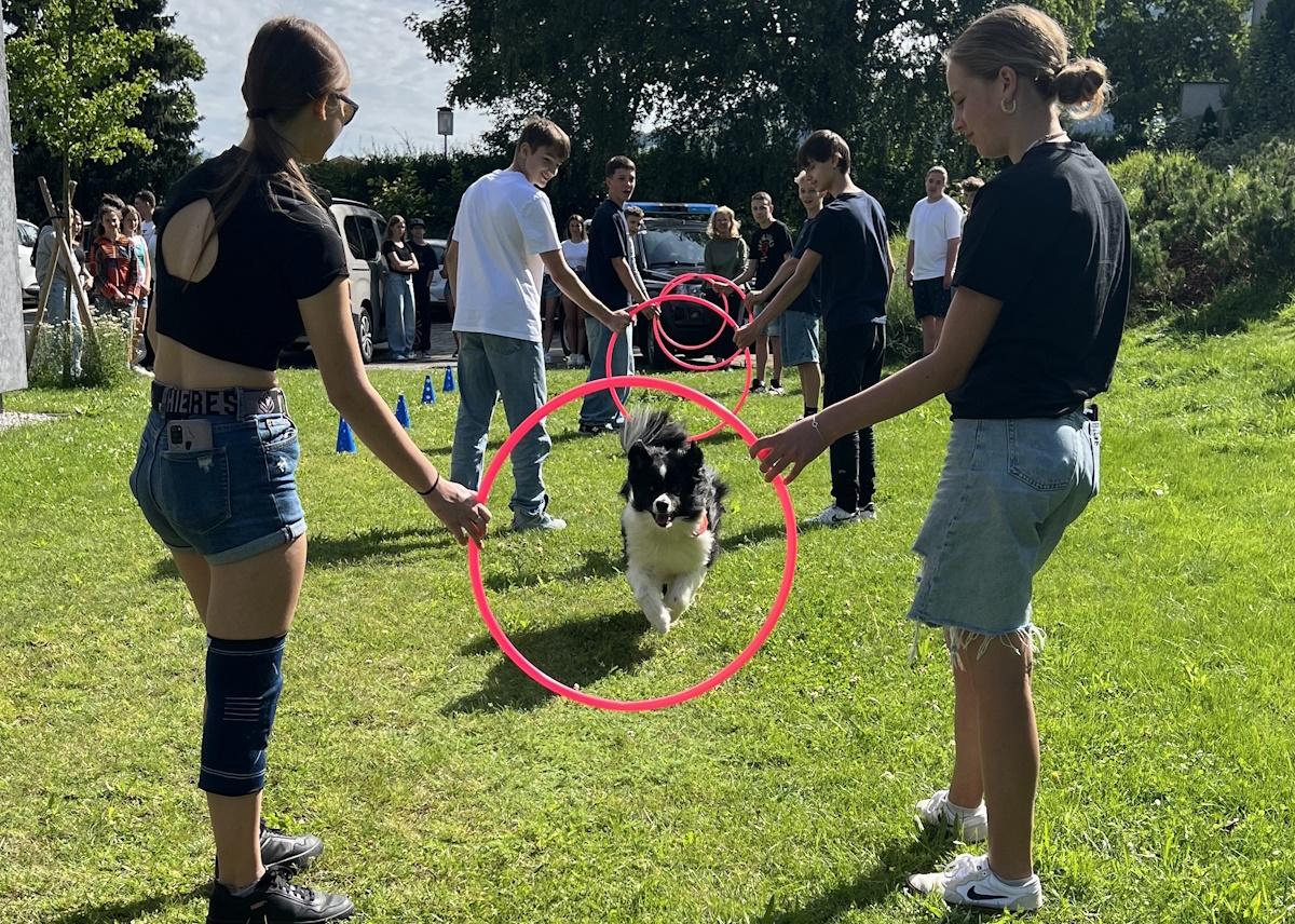 Nach dem theoretischen Teil wechselten wir in den Schulhof und die 4b kam zur Theorie. Dort wurden uns die zwei Diensthunde Livi und Lee vorgestellt. Die Hunde sind vollständig für ihre Aufgaben ausgebildet. Die zwei Vierbeiner sind sehr sportlich und können über oder durch Hindernisse springen. Wir duften verschiedene Spiele und Aufgaben mit den Hunden machen und sind sehr dankbar, dass wir die Bergwacht besser kennenlernen konnten.