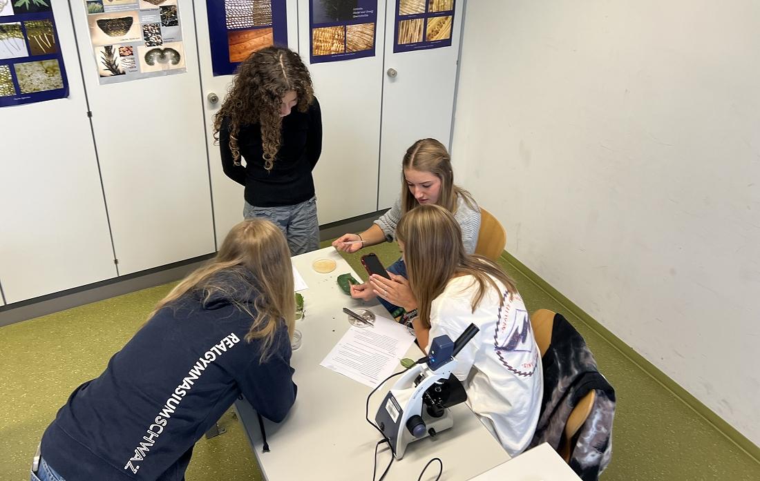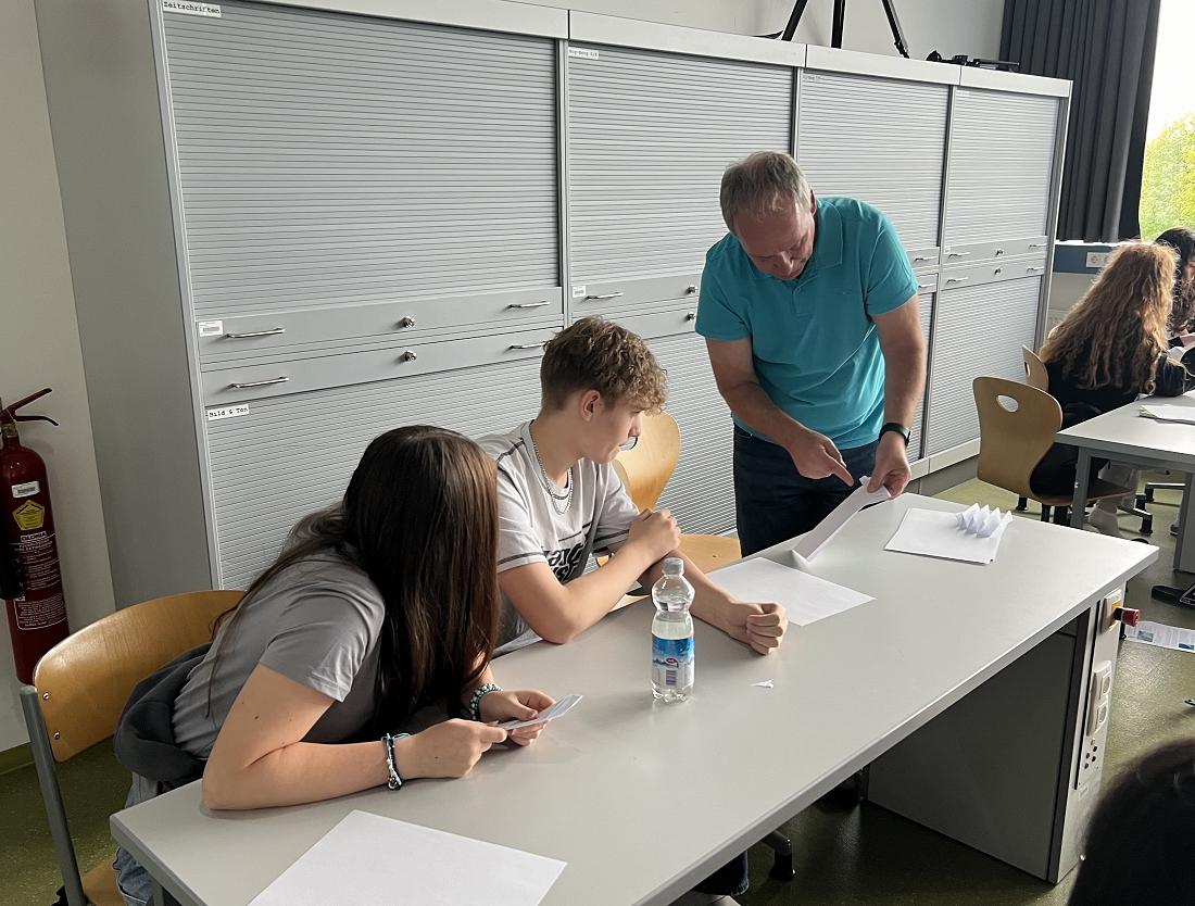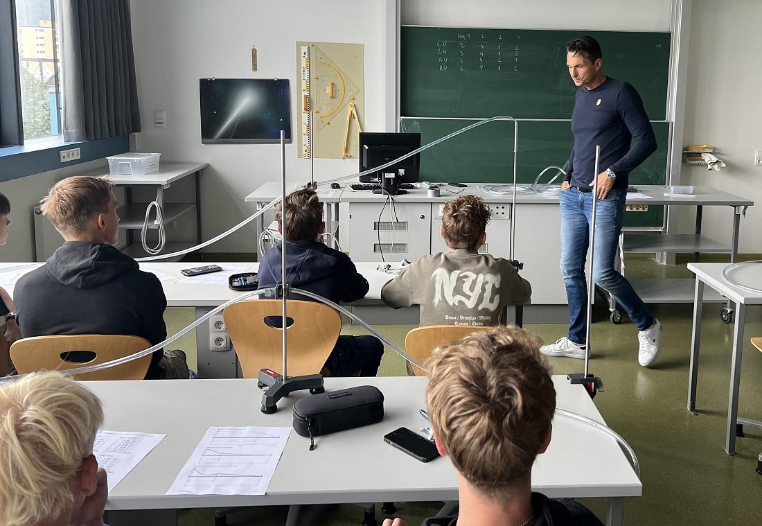 Donnerstags konnten wir Prof. Thorsten Schwerte, Leiter des Instituts für Zoologie, bei uns begrüßen: Er hielt im Rahmen des Euregio-Projekts „MINT Grenzenlos“ einen interaktiven Vortrag, bei dem es um den Lotus-Effekt, Flugsamen und den beruflichen Werdegang im Forschungsfeld Bionik ging. Ergänzend wurden von unseren Physiklehrern Prof. Berger und Prof. Schulze Experimente zum Brachistochronen-Problem und zum Lotus-Effekt angeboten, welche die Schüler:innen durchführen konnten.
