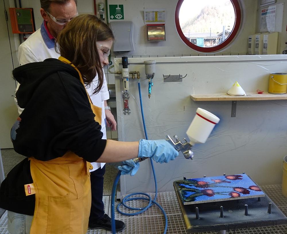 Im Anschluss an die Führung durften die SchülerInnen einige Produkte der Firma Adler selbst ausprobieren und ihrer Kreativität beim Gestalten von Spritzbildern freien Lauf lassen. Die Ergebnisse sind wirklich schön geworden!
