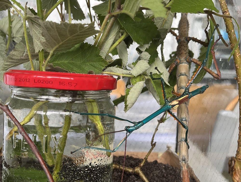 Insekten sind mit ihrem Artenreichtum eine besonders spannende Tiergruppe, die zumeist in der zweiten Klasse besprochen wird. Heuer haben wir dazu auch noch exotische Besucher zu Gast. Für einige Wochen konnten wir uns über die „Tierleihe“ vom Institut für Fachdidaktik (Bereich Mathematik und Naturwissenschaften) drei verschiedene Insektenarten für den Unterricht ausleihen: Peruanische Samtschrecken, Wandelnde Blätter und ein Pärchen der Türkisblauen Riesenstabschrecke bereichern nun den Biologie-Unterricht.