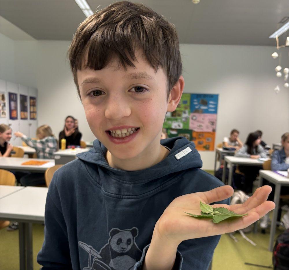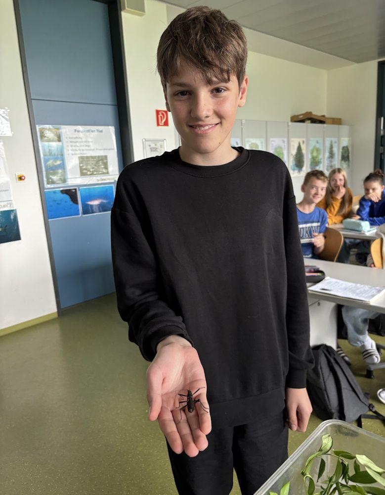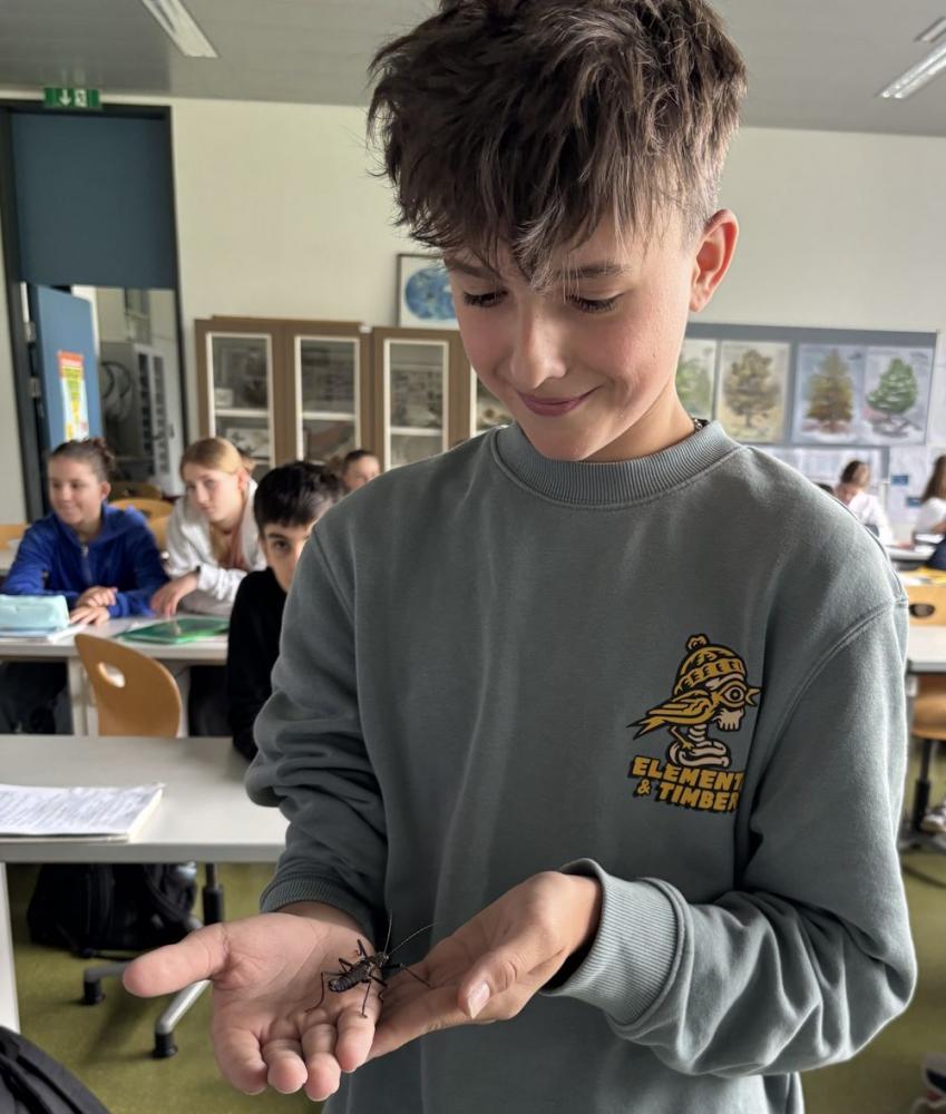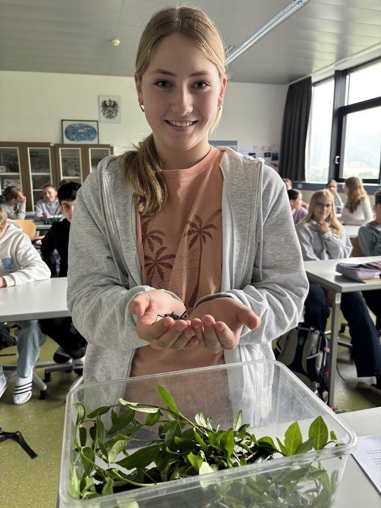 Sie sind nicht nur wunderschön anzusehen, sondern können von unseren unerschrockenen SchülerInnen (wie hier aus der 3c und 1b) auch gefahrlos auf die Hand genommen werden. Und (fast) nebenbei werden auch noch wichtige Begriffe wie Mimese (Tarntracht), Parthenogenese (Jungfernzeugung) oder Endemismus (nur in einem begrenzten Gebiet vorkommende Arten) zum „Aha-Erlebnis“.