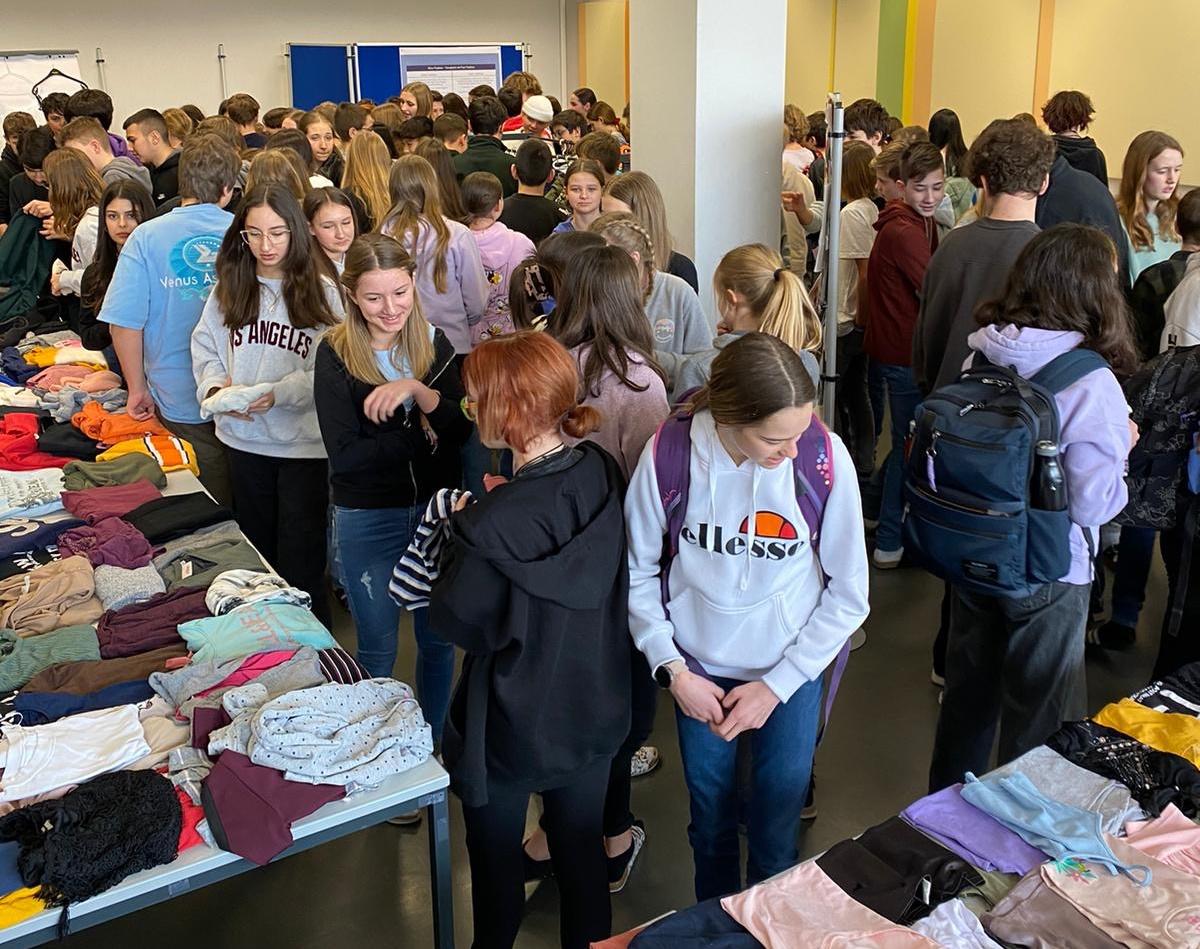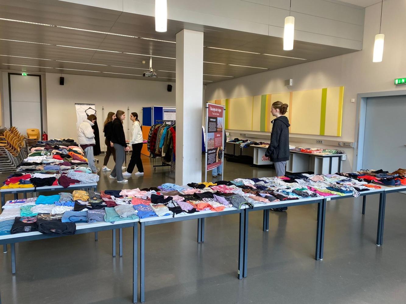 Nach einer durch Corona bedingten Pause fand am Montag, dem 27. 2. 2023, wieder der Kleidertauschmarkt statt. Organisiert wurde dieser von der 7R-Klasse. Als informativen Einstieg bereitete die Religionsgruppe 7S/7B eine Präsentation zum Thema Fast Fashion vor.