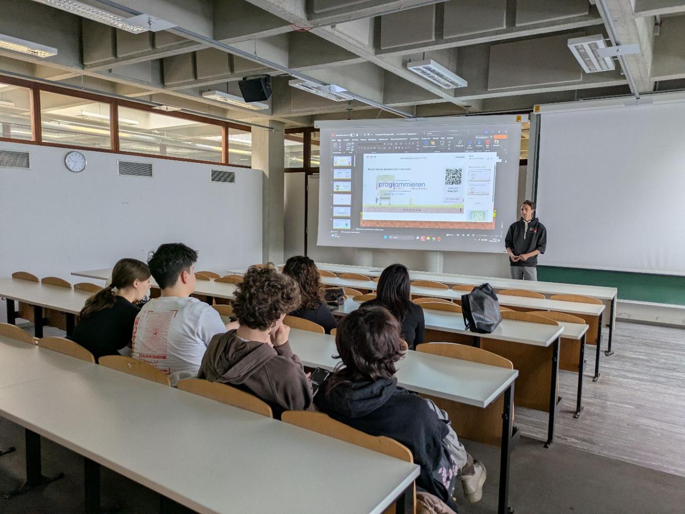 Zwei Master-Studenten des Informatik Institutes der Universität Innsbruck betreuten die Schülerinnen und Schüler der 6B am 27.03.2026 an ihrem letzten Tag der Informatikwoche 2026. In einem interaktiven Vortrag bekamen die Schülerinnen und Schüler spannende Einblicke in das Informatikstudium. Eine Campusführung rundete die gelungene Präsentation des Institutes für Informatik ab. Vielen Dank für das Kennenlernen des Informatikstudiums an der Uni-Innsbruck.