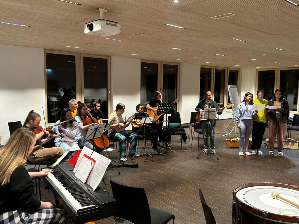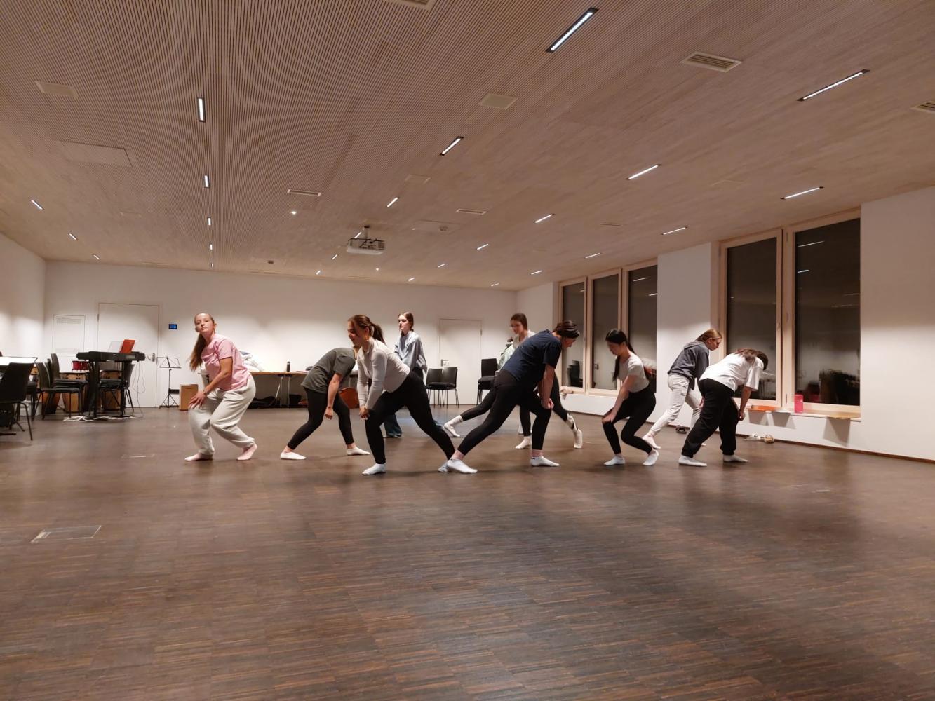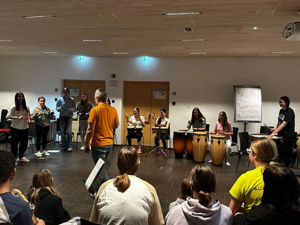 Nach der Ankunft wurden die Klassen in ihre Zimmer und Gruppen eingeteilt, ein paar Informationen besprochen und die Referenten Daniel Renner (Choreografie) und Werner Raubek (Perkussion) wurden vorgestellt. Danach ging es direkt mit Singen, Tanzen und Komponieren los. Die Woche wurde in einzelne Workshops unterteilt, in denen die Schüler*innen eigene Stücke umkomponierten, berühmte Lieder mit einer Band einstudierten und eine Choreografie erlernten.
