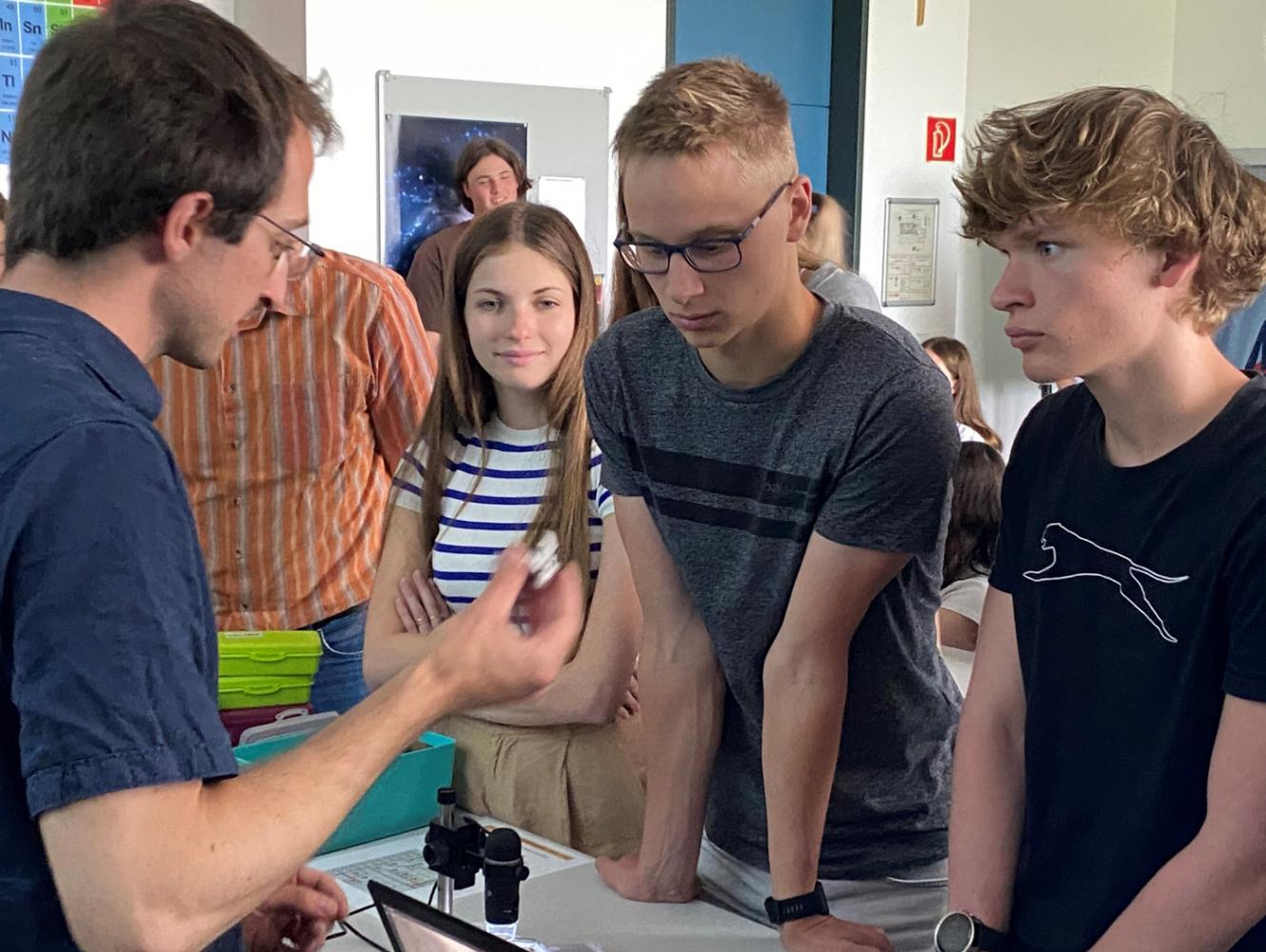 Den Höhepunkt bildete anschließend der Vortrag vom ECR Start Grant Gewinner Dr. Martin Ringbauer von der Universität Innsbruck. Er unterbrach seine Arbeit in der Quantenoptik und Spektroskopiegruppe von Prof. Blatt, eine der weltweit führenden Arbeitsgruppen auf diesem Gebiet, um unseren Schüler*innen als Wissenschaftsbotschafter zur Verfügung zu stehen. Organisiert wurde dies über die OEAD (Agentur für Bildung und Internationalisierung). Ein ausführlicher Einblick in die Funktionsweise und die Anwendbarkeit des Quantencomputers standen auf dem Programm. Die Schüler*innen konnten dabei das Herzstück eines Quantencomputers, die Ionenfalle, angreifen bzw. die neuste Version, eine zweidimensionale Falle, mittels Mikroskop anschauen. Neben fachlichen Fragen wurde den Schüler*innen auch ein ausgezeichneter Einblick in den Alltag eines Naturwissenschaftlers in der Spitzenforschung vermittelt.