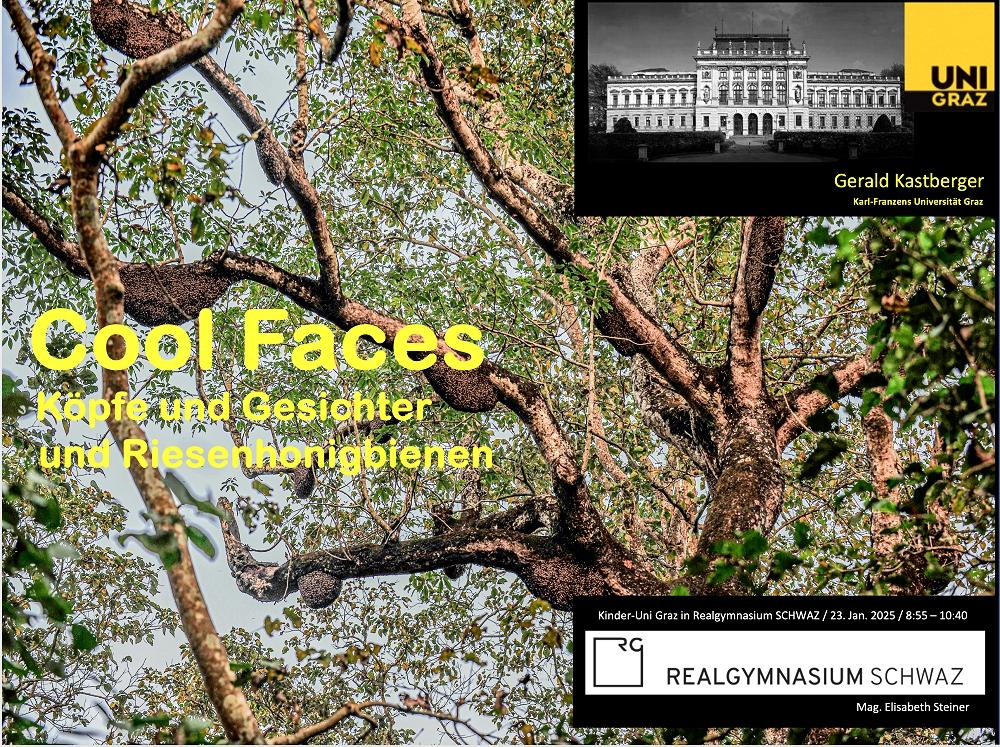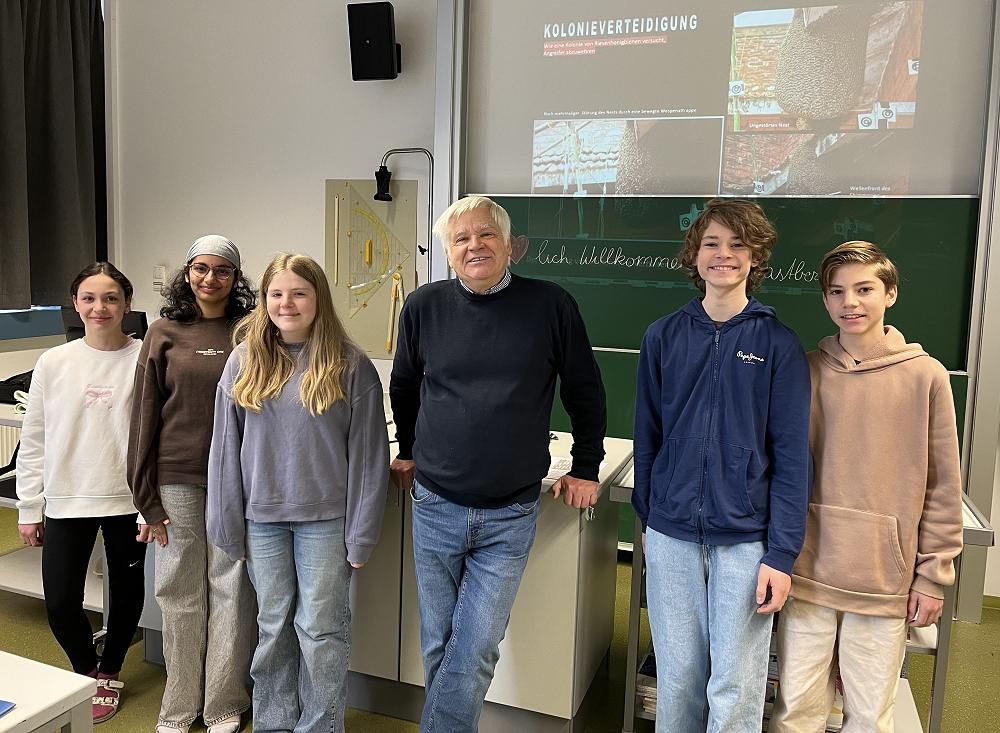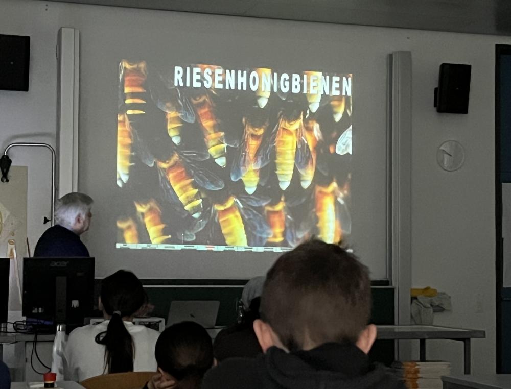 Um die wissenschaftliche Arbeitsweise zu veranschaulichen, startete die Klasse mit einem Wahrnehmungsexperiment, die Daten wurden gesammelt und ausgewertet, und im Zusammenhang mit „face detection“-Software zu Mimikry-Phänomenen im Tierreich übergeleitet. Dr. Kastberger zeigte uns viele wunderbare Aufnahmen von seinen Forschungsreisen und erzählte dabei viel Interessantes über Honigbienen auf der ganzen Welt. Mit dem Forschungsschwerpunkt des „shimmering-Verhaltens“ der Riesenhonigbiene zur Abschreckung einer Gefahr kehrte er am Ende der Doppelstunde wieder zu unseren SchülerInnen zurück, die in einem abschließenden Experiment noch eine „La Ola-Welle“ nachstellten, um ihre Reaktionsgeschwindigkeit mit der der Honigbienen zu messen. Wer dazu noch mehr wissen möchte, dem seien die mit diversen Preisen ausgezeichneten Dokumentarfilme unseres Besuchers ans Herz gelegt, wie z.B. „Assam, im Land der Bienenbäume“. Wir bedanken uns herzlich für den Besuch!