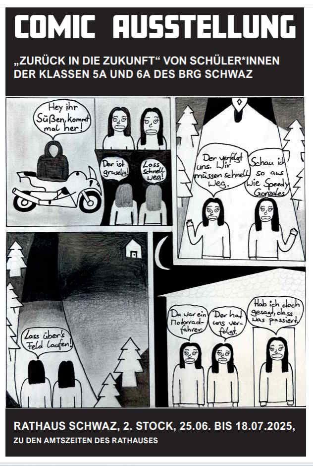 Im Rahmen des „Silbersommers Schwaz – Zurück in die Zukunft“ präsentieren die Klassen 5a und 6a des BRG Schwaz ihre selbst gezeichneten Comics im Rathaus. Entstanden sind die Werke im Anschluss an einen Workshop zum Weltmädchentag, initiiert von der Stadtgemeinde Schwaz und geleitet von der Illustratorin Isabel Peterhans im Kunstraum Schwaz.