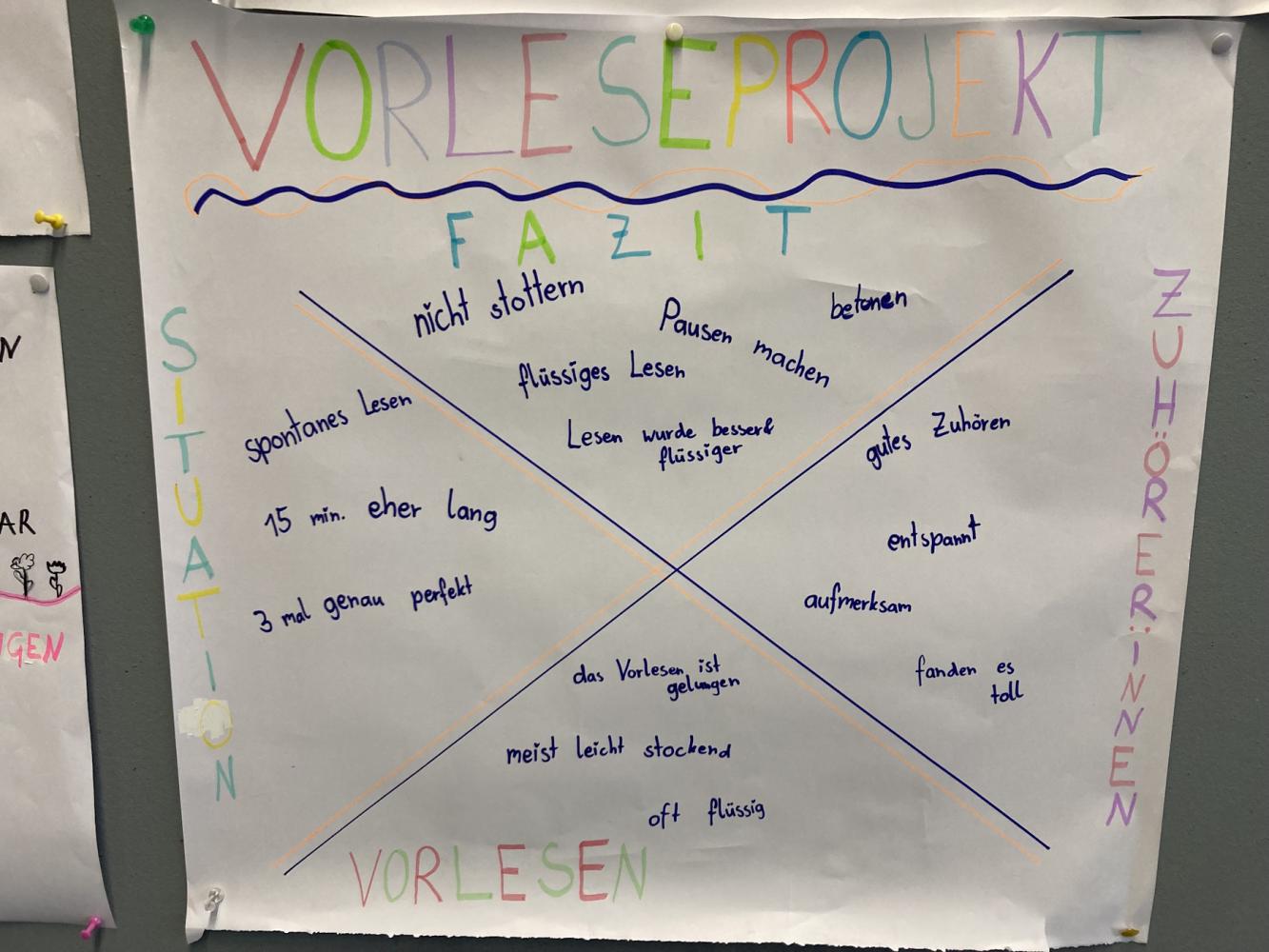Das Fazit der Schüler:innen zum Projekt: Das Lesen wurde vom Beginn des Projektes bis zum Ende hin meist flüssiger, die Zuhörer:innen haben das Vorlesen genossen, 15 Minuten waren allerdings zu lang und man sollte als Vorleser:in vor allem darauf achten, Pausen zu machen, möglichst wenig zu stottern und das Gelesene entsprechend zu betonen.