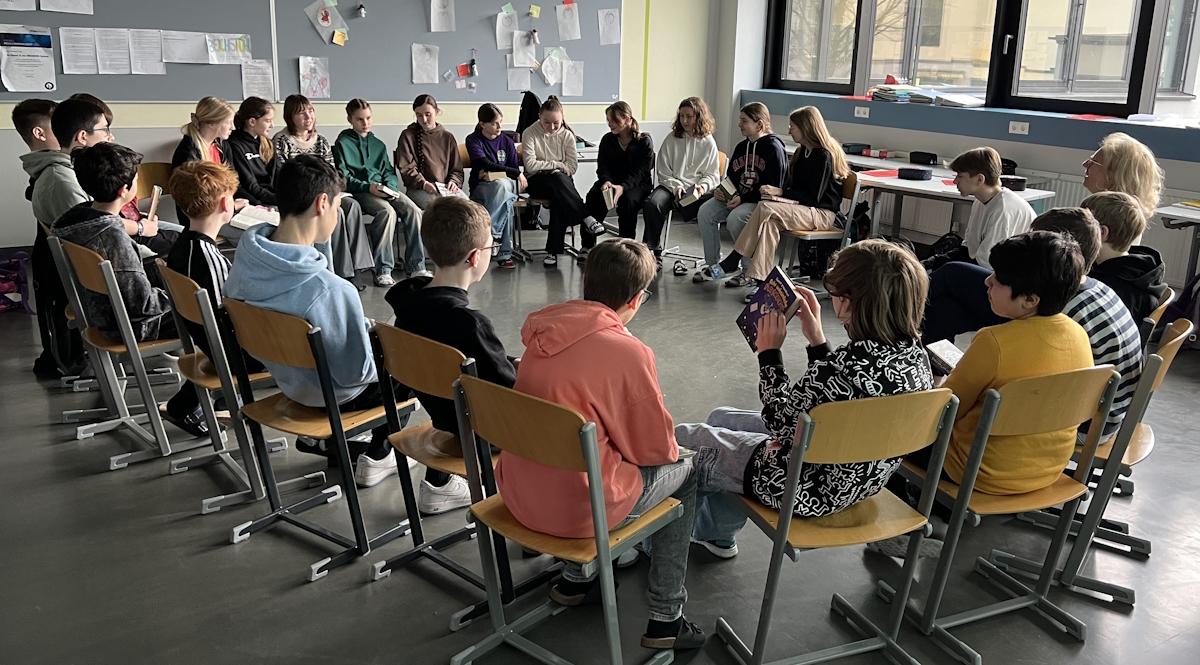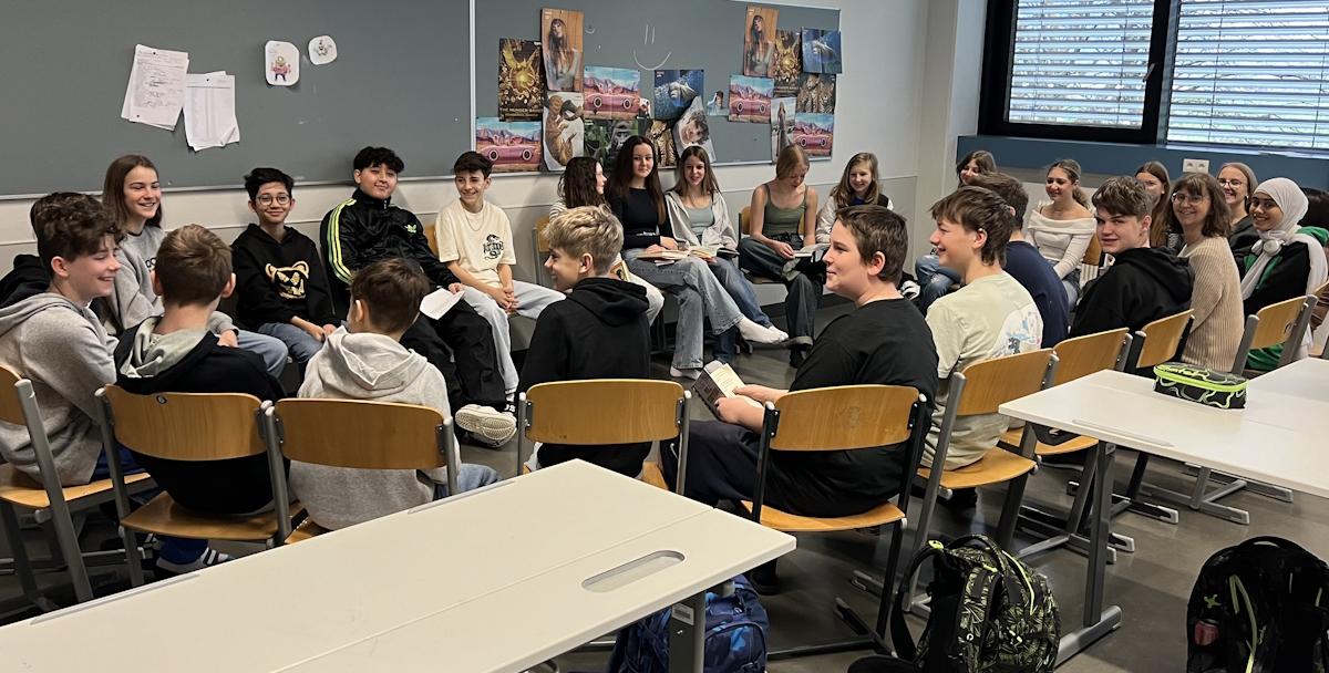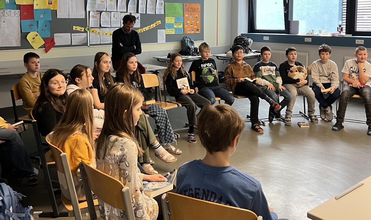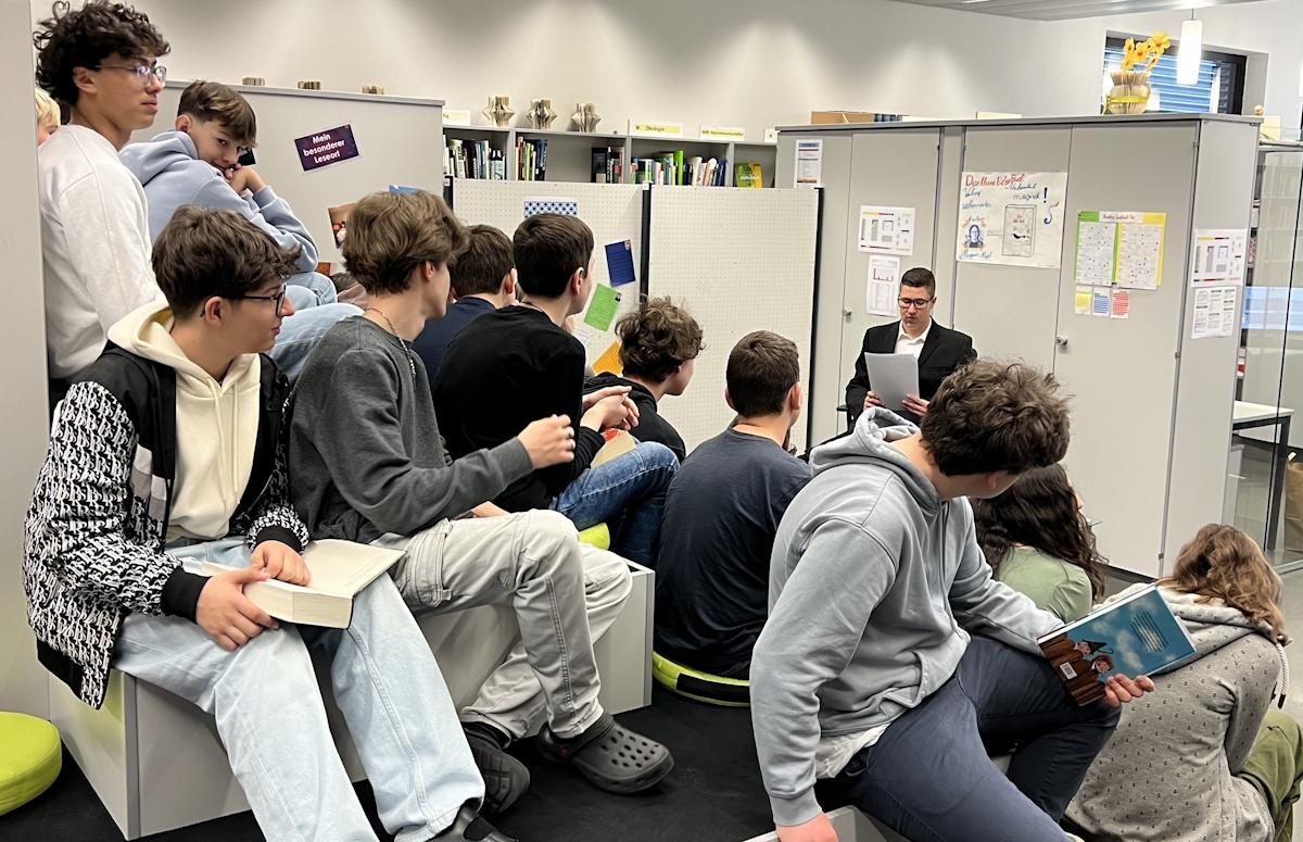 Ein Highlight stellt die Präsentation von Florian Wenzel aus der Klasse 4c dar, der in der Schulbibliothek aus seinem eigenen Science-Fiction-Roman „TECH - THE BEGINNING“ vorliest. Bei den Schüler*innen der Klasse 4d kommt die Lesung sehr gut an.