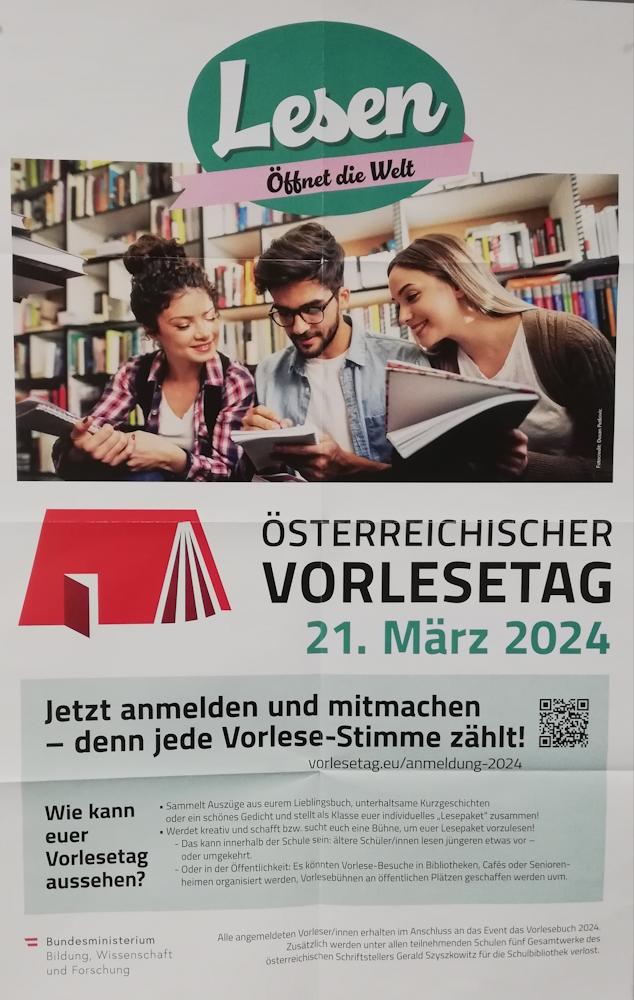 Der 21. März steht im BRG/BORG Schwaz ganz im Zeichen des österreichischen Vorlesetags. In allen Klassen der Schule findet in der ersten Stunde ein „Lesefrühstück“ statt. Während dieser Stunde lesen Lehrpersonen und Schüler*innen aus ihren Lieblingsbüchern vor. Gemeinsam wird eine Atmosphäre des Zuhörens und Sich-Wohlfühlens geschaffen.