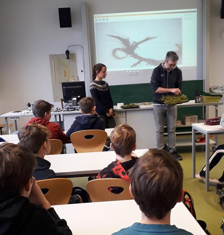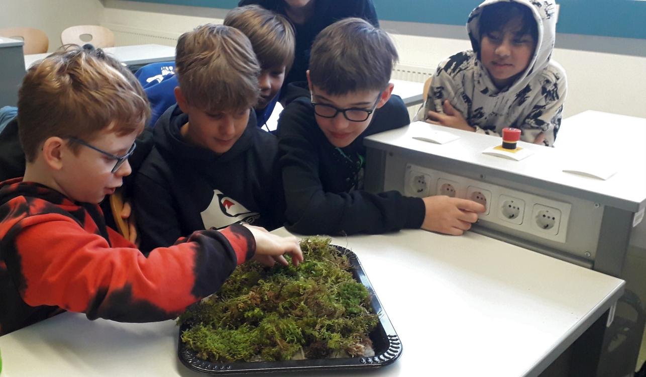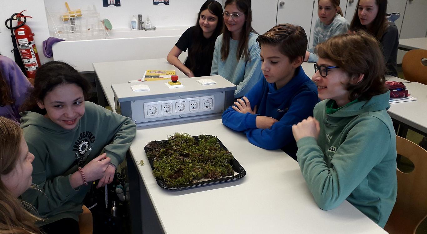 Im Rahmen des Biologie-Unterrichts der 2B wurde am Freitag den 19.1. ein Moose-Workshop von der Grünen Schule des Botanischen Gartens der Universität Innsbruck abgehalten. Zu Gast waren Ramona Roach und der Moose-Spezialist Christian Anich, um uns in die Lebenswelt und Vielfalt dieser besonderen Pflanzen einzuweihen. Die SchülerInnen der 2B rückten sodann den verschiedenen Exemplaren mit den Lupen zu Leibe, um zum Beispiel die Merkmale des „Großen Runzelbruder“ zu erforschen. Zum Schluss entdeckten wir bei einer kurzen Suche in unserem Schulgarten sogar noch einige interessante Moose und wissen nun, dass in Tirol bis zu 870 verschiedene Arten vorkommen!